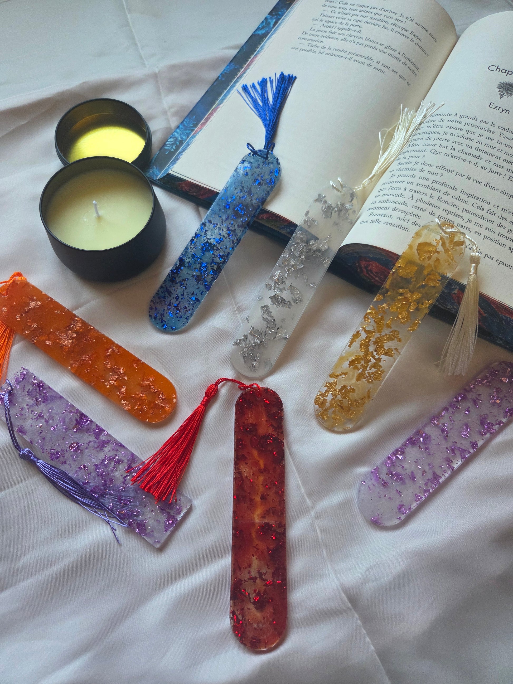 Découvrez notre collection de marque-pages en résine artisanale, décorés de feuilles métallisés aux reflets uniques : violet, bleu, doré, doré rosé, rouge, argenté ...