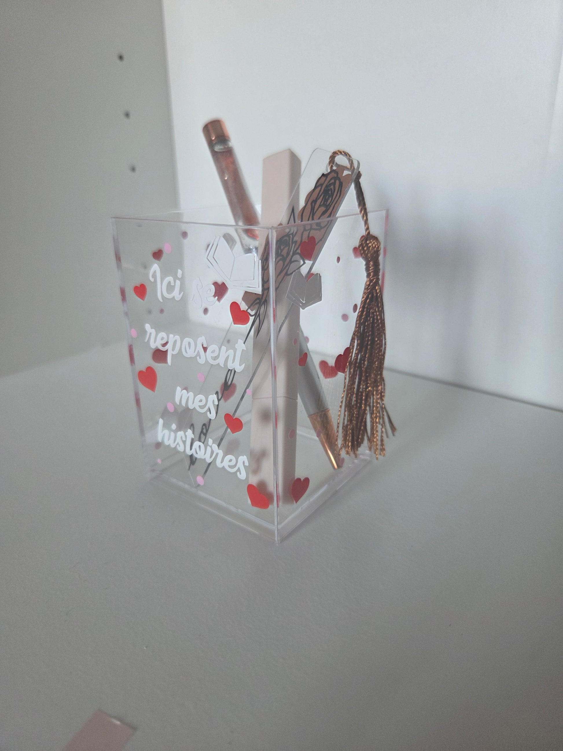 Ce pot transparent décoré à la main est parfait pour accueillir vos stylos, post-it ou marque-pages préférés.